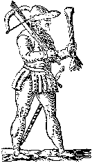 In all the wars of this period the bow was the favourite weapon of the English Yeomanry, who constituted the strength of the army, and every man was obliged by law to be trained in its use from the age of seven years. It became in skilled hands a terrible and fatal weapon. When in training, a man who reached the age of 24 years, by an Act 33rd Henry V111, was not allowed to stand nearer to the butts than 220 yards, the bow was required to be the length of the person holding it. Every man was obliged to be provided with one and a sufficient quantity of arrows, and officers were appointed to see that they were constantly kept ready for service. The arrows were generally feathered from the wing of a goose.